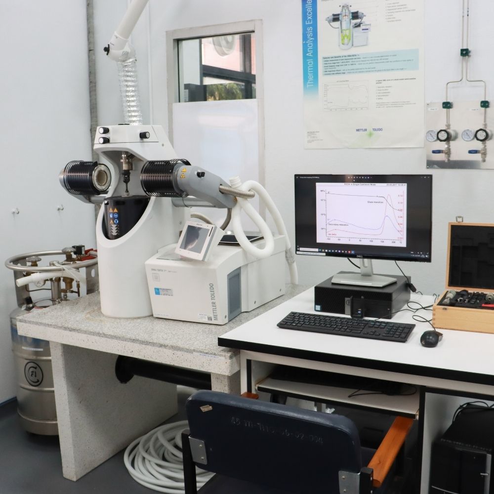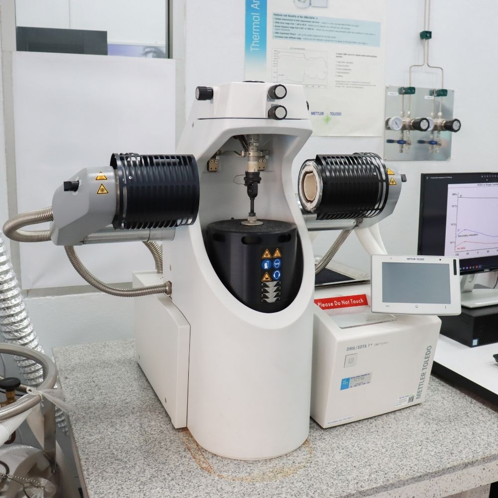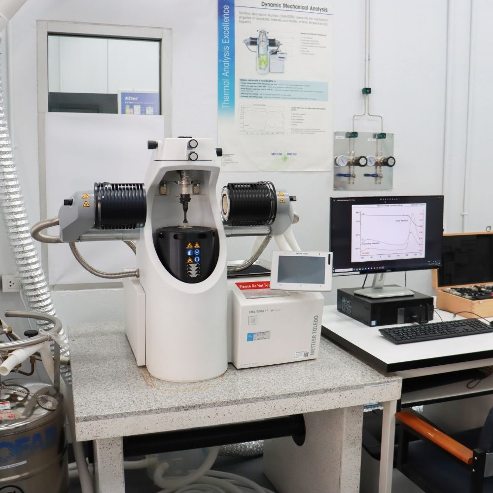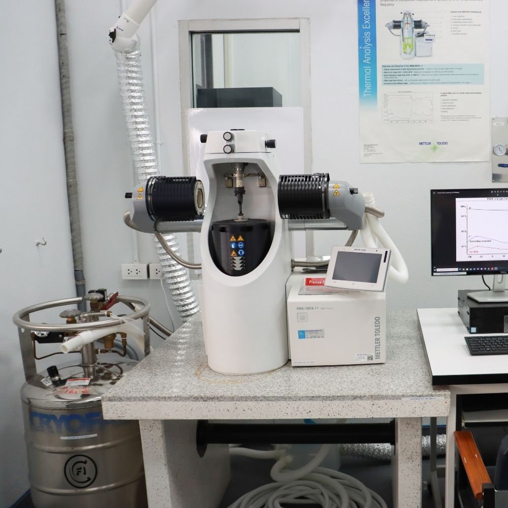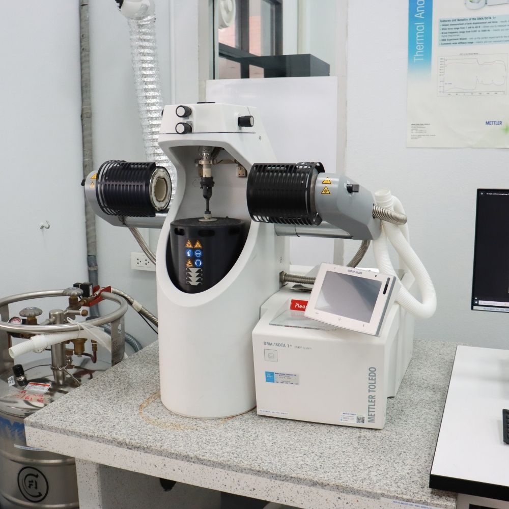 - วัดสมบัติเชิงกลและสมบัติความหยุ่นหนืดของวัสดุต่าง ๆ - แผ่นฟิล์ม แผ่นยาง และพอลิเมอร์ที่ขึ้นรูปแบบแท่ง - โหมด 3-point bending, Dual cantilever และ Single cantilever ขนาดชิ้นงาน ยาว <80 mm. กว้าง <8 mm. และหนา <1.2 mm. โหมด Shear ขนาดชิ้นงาน ยาว <5 mm. กว้าง <5 mm. และหนา <1.2 mm. โหมด Compression ขนาดชิ้นงาน ยาว <5 mm. กว้าง <5 mm. และหนา <4 mm. โหมด Tension ขนาดชิ้นงาน ยาวไม่จำกัด กว้าง <3 mm. และหนา <6.5 mm.