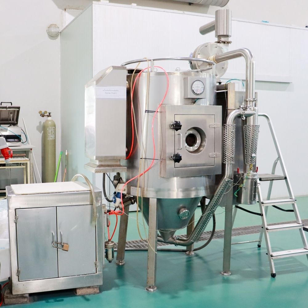 เครื่องมือทำแห้งแบบพ้นฝอย เหมาะสำหรับการทำแห้งอาหารที่มีสถานะจากของเหลวเป็นในรูปของผง เช่น นม น้ำผลไม้ เป็นต้น