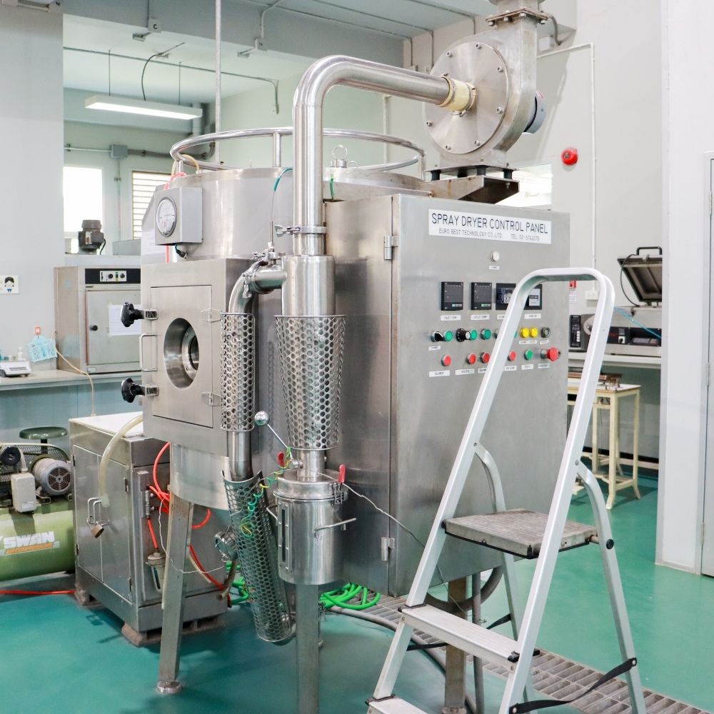 ความสามารถ: เครื่องทำเเห้งเเบบพ้นฝอย ที่สามารถควบคุมอัตราการพ่น อุณหภูมิ เเละเวลาในการอบเเห้ง ข้อจำกัด: ไม่เหมาะกับตัวอย่างที่เป็นของเหลวที่มีความหนืดสูง รายละเอียดตัวอย่าง: อาหาร เครื่องดื่ม ยา ตัวอย่างทางเคมี