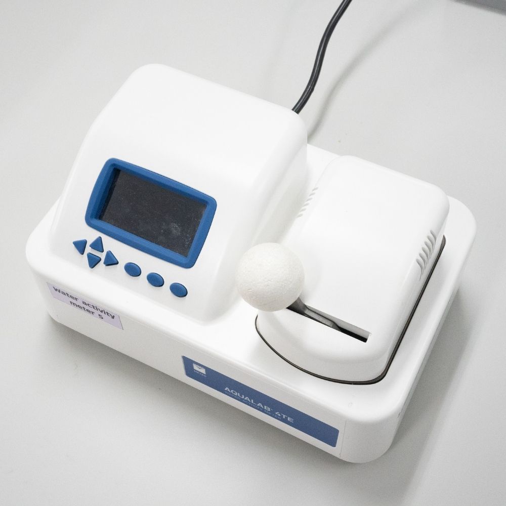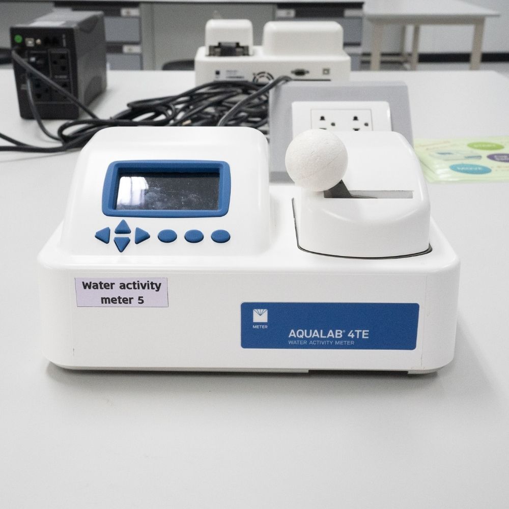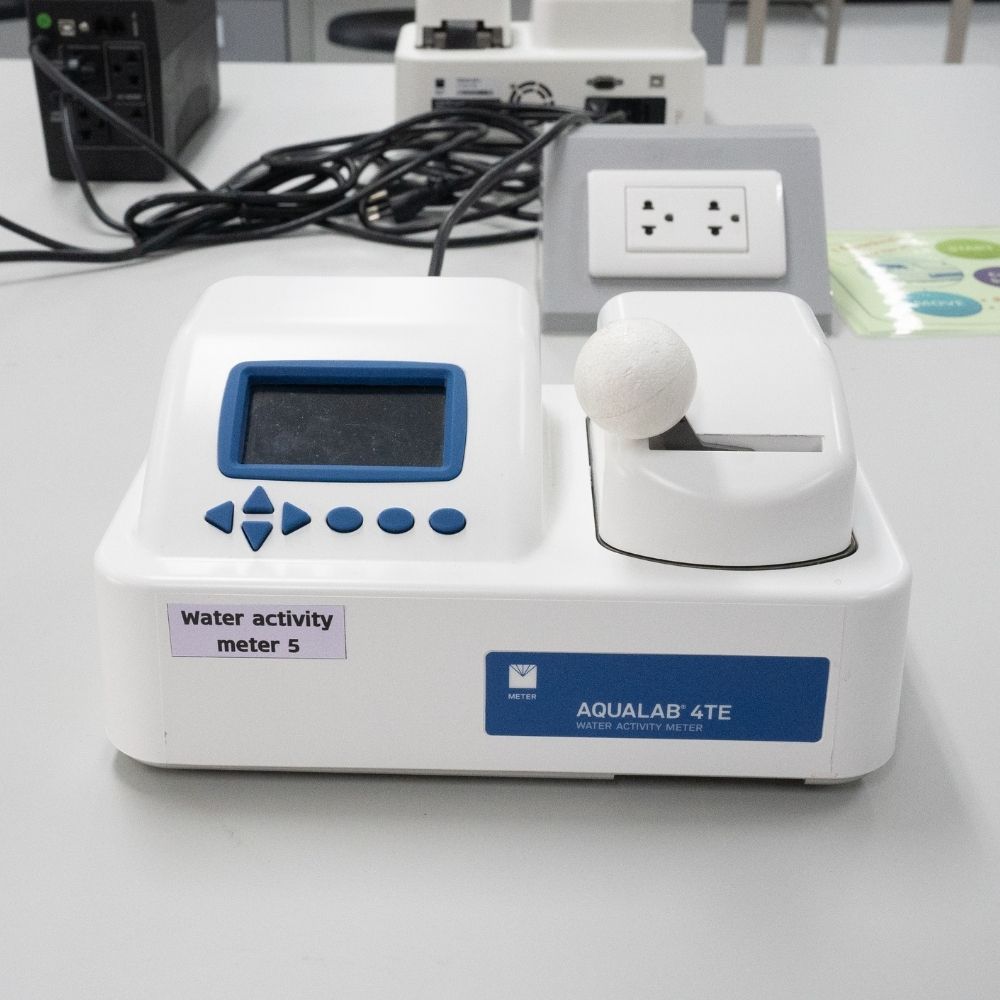 ความสามารถ: เครื่องมือวัดค่าปรมาณน้ำอิสระ ในของเเข็ง ผงละเอียด เเละของเหลว ใช้ในการประเมินความเสถียร เเละความปลอดภัยของผลิตภัณฑ์ เนื่องจากปริมาณน้ำอิสระส่งผลต่อการเจริญเติบโตของจุลินทรีย์ เเละปฏิกิริยาเคมีภายในผลิตภัณฑ์ โดยใช้เวลาไม่เกิน 5 นาที มีความเเม่นยำ +- 0.003aw ข้อจำกัด: ไวต่อตัวอย่างที่มีสารระเหย หรือไขมันสูง อาจจะทำให้เกิดการปนเปื้อนตรงเซ็นเซอร์ส่งผลต่อความเเม่นยำในการวัดค่าaw รายละเอียดตัวอย่าง: อาหาร ยา เเละผลิตภัณฑ์เครื่องสำอาง